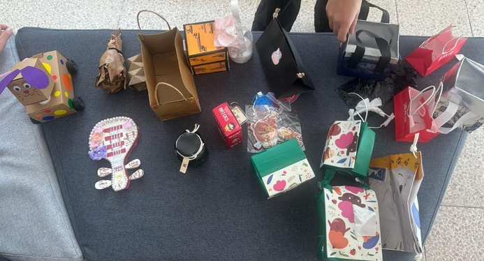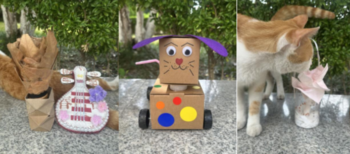 活动中,同学们围绕校园常见闲置物品如旧纸箱、塑料瓶、快递包装等,展开天马行空的创作。有同学将旧纸箱精心打造成古韵琵琶摆件,以珍珠勾勒轮廓,用毛绒花朵点缀琴身,融合传统乐器元素与现代装饰风格,既是一件精美的桌面陈设,又展现对传统文化的创新表达。还有同学把废旧纸箱和小轮子结合,制作出萌趣纸箱小狗玩具车,紫色毛绒耳朵俏皮可爱,彩色圆点贴纸活力满满,不仅是同学们的玩伴,更体现废物利用的巧思。此外,旧衣物被改造成个性挂件、瓶盖拼贴成创意装饰画等作品也层出不穷,每一件都凝聚着同学们的创意与匠心,让“旧物”真正实现“焕新颜”。