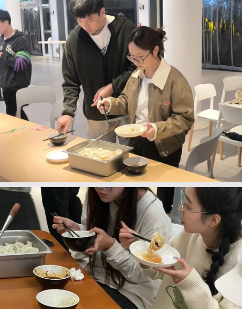 在包饺子环节后,大家开始等待煮好的饺子,期间参与了各种有趣的小游戏。等到饺子煮好后,食堂工作人员将热腾腾的饺子送到大家手中,大家围坐在一起,品尝着美味的饺子。食堂还贴心地为同学们准备了小料和醋,大家一边品尝美食,一边感受着冬至节日的温馨与传统文化的魅力。