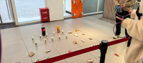 在套圈环节,地上摆放着琳琅满目的零食和饮料,吸引了同学们的眼球。大家排队站在红线外,每位同学手中拿着三个圈,等待着展示自己的投掷技巧。每一位同学投掷时积极调整姿势,专注地将圈一个个投掷出去,力求将圈套中自己心仪的奖品。每当有同学成功套中零食或饮料时,现场都会爆发出一阵欢呼声和掌声,气氛轻松愉快,大家的热情和参与感让整个环节充满了挑战与欢乐。