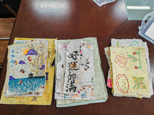 活动开始前,工作人员对活动中纸张来源与活动基本流程进行了讲解,本次活动所用到的纸张由中南大学校本部幼儿园的小朋友们收集落叶、废纸等材料加工而成,志愿者们需在这些纸上进行书画创作,作品将会移交给校本部幼儿园进行义卖,义卖筹集善款将会全数捐赠给山区儿童。拿着这些别出心裁的纸张,志愿者们感受着纸上凹凸不平的纹路,纷纷对幼儿园小朋友们动手与创造的能力表示称赞。“小朋友们真是心灵手巧,这些再生纸张不仅花纹独特,还体现了环保主张。”一位志愿者感叹道。