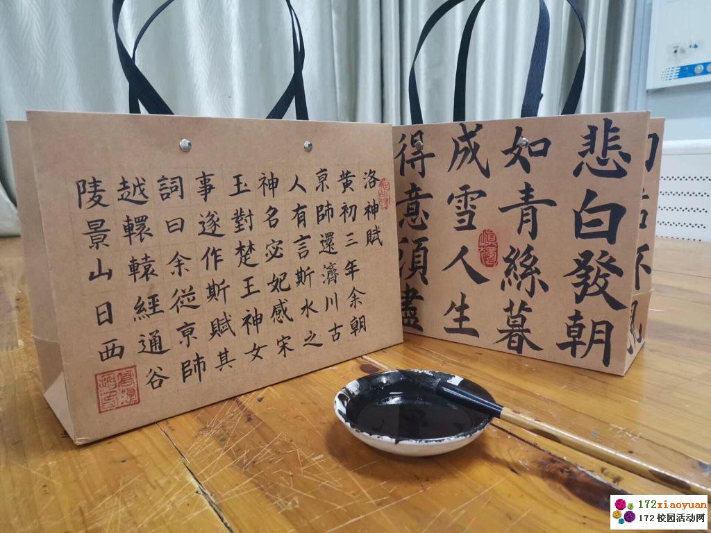 活动伊始,工作人员提前将场地布置好,便于参赛人员领取物品,进行作品创作,并告知活动要求,规范活动形式。同学们豪情挥墨,尽展才华,作品涉及的题材丰富,呈现出笔力挺劲的行书、方圆相济的篆书、端庄严谨的隶书,浑厚有力、收放有度、风格鲜明,令人赞不绝口。其中,更有用丹青点染创作的手法,新颖有趣。一个个DIY书法联名环保纸袋饱含同学们的创意以及深厚的书法底蕴。本次参赛作品交由专业的评审团进行筛选最终评选出一等奖3名,二等奖5名,三等奖12名。