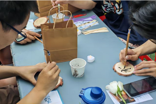 同学们在规定时间内制作属于自己的书法文创。大家手执毛笔,在原木块,竹编,书签,书法风铃等材料上即兴创作,让生活中随处可见的物品变成一件件艺术品。