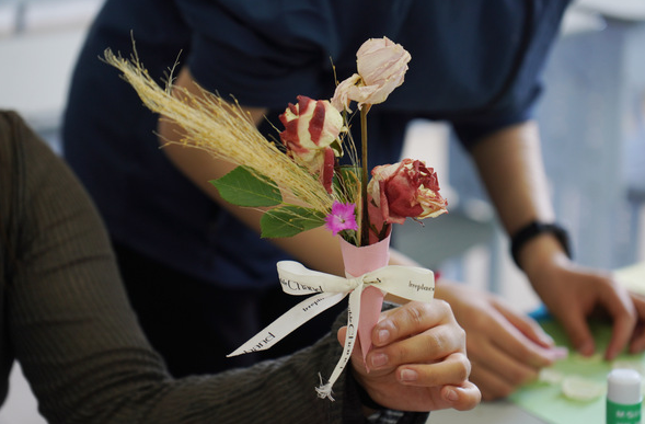 团支部成员们将干花变废为宝,体现其中价值。“以前觉得干花只是枯萎的植物,现在发现它们像被封印的宝藏!”支部成员姜海硕分享创作心得。她将干花一片片粘在卡片上,一串栩栩如生的葡萄出现在我们眼前。