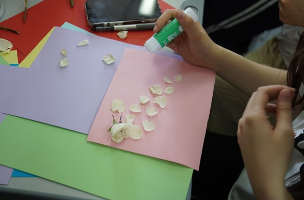 活动现场,色彩斑斓的卡纸、水彩颜料与各样的花草巧妙碰撞。支部成员们或低头专注拼贴,或三两成群讨论构图。有人用花瓣勾勒出抽象的春日图景,有人以卡纸为包装,将干花包裹变成永不凋零的花朵。每一幅作品都承载着独特的巧思,将春日的浪漫定格为永恒。