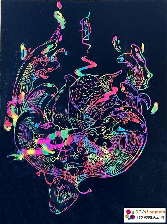 20级环境设计专业杨贤浩刮画作品《“粽”得功成》以龙舟为主要元素,将粽子作为点缀其中,缤纷的波浪与高山、青荷、野鹤、绿叶相融合,通过缤纷绚丽的色彩构成效果,将端午节的构成元素与文化内涵生动地表达了出来。