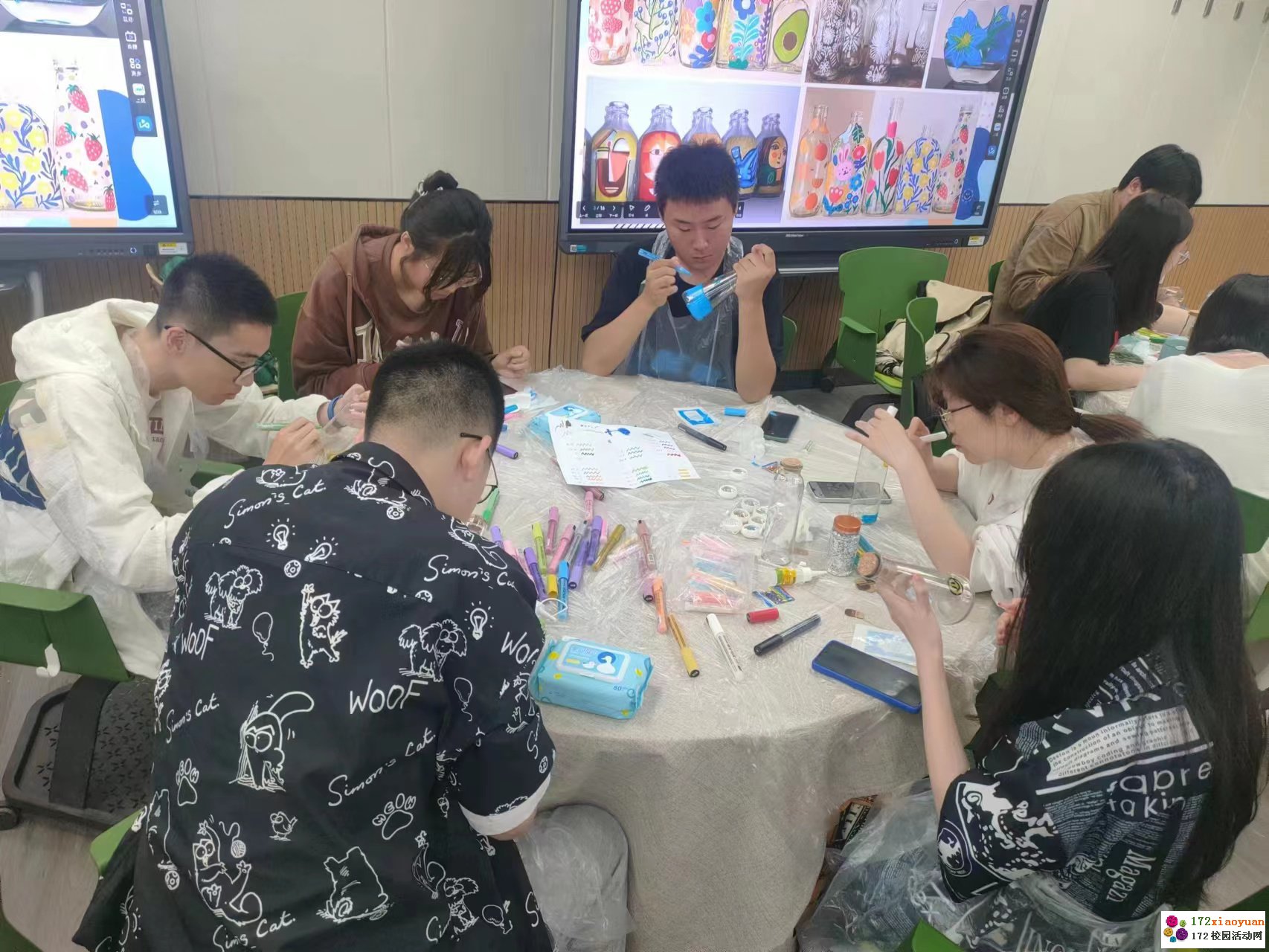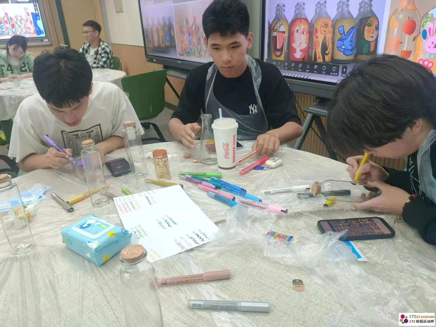 首先,开心使者向同学们介绍了本次活动的意义和规则,而后带领同学们进行了一个正念小练习,借助玻璃瓶去观察自我的喜悲,透过玻璃瓶窥见情绪的起源。玻璃瓶对于同学们是心灵的容器,是自我表达的载体,在玻璃瓶上绘画更是一种自在发挥,任意表达的愉悦体验。在工作人员为参与者分发了多种形状的玻璃瓶以及各种绘画所需的工具后,同学们就开始认真按照自己的构思去专注绘画。
