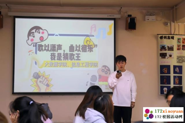 活动开始,由主持人朗读歌词,选手需要抢答猜歌名。一句句朗朗上口萦绕心头的歌词,一张张洋溢着青春的笑脸,都争相展示着同学们的青春与热情,比赛中同学们积极抢答,而且同学们答题的正确率极高。每一首歌曲都是精心选取,每一句歌词都讲述了一个独特的故事。