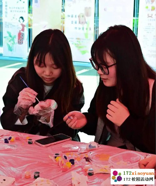 本次活动一共包含五个主题板块,分别是“美物”“美景”“美人”“美食”和“美言”,为女神们创造感受美的平台。“美物”活动是最为火爆的,女生们坐在一起做DIY发卡、穿手链、画石膏娃娃、创作流体熊、画数字油画,气氛热烈,参与活动的同学还得到了⼯作⼈员精⼼准备的鲜花和小礼品,活动现场处处弥漫着青春浪漫的⽓息。“美景”活动中邀请了40位女神们在书香语林创作自己的花艺作品,让女神们在花卉的芳香和美妙中体会经典的东西方文化。