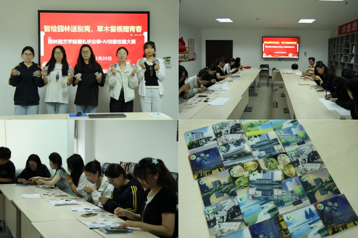 这场名为“智绘园林送别离,草木留痕赠青春”的AI创意绘图活动,要求以校园实景为原型,融入植物形态、空间构图等专业元素进行绘图。大赛征集结束后,园林园艺学院学工办开启了一场跨年级的匠心接力。学院购置了冰箱贴DIY材料,组织大一大二学生将获奖的AI绘图作品转化为实体纪念品。
