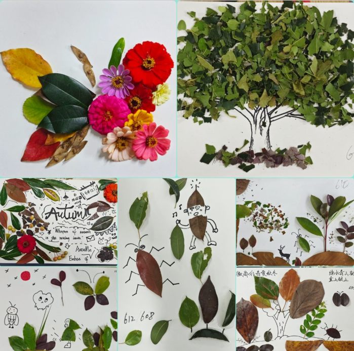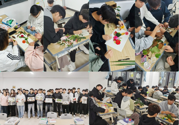 收集完素材后,各宿舍小队带着满满的“秋日宝藏”回到班级,在晚自习的轻松氛围中展开创意创作。同学们围坐在一起,将各类树叶、花朵按形状、颜色分类整理,细细比对,低声讨论构图,调整拼贴角度——用叶片拼出灵动的小鸟、跳跃的小鹿,在作品旁提笔写下秋日诗句。笔尖流转间,简单的落叶与落花仿佛被赋予了生命力,一幅幅充满文艺气息的秋景拼贴画渐渐成形,每一笔、每一片都承载着同学们对徽院秋景的热爱。