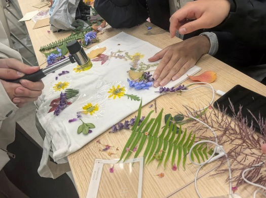 回到教室后,大家展开创作,将花叶拓印、拼贴或封存于帆布袋、信纸与书签中。捶打声、笑声与讨论声交织,空气中弥漫着草木清香与创作热情。作品评选环节中,各组成果色彩鲜明、创意独特,第五组、第九组和第七组最终荣获前三名,赢得阵阵掌声。