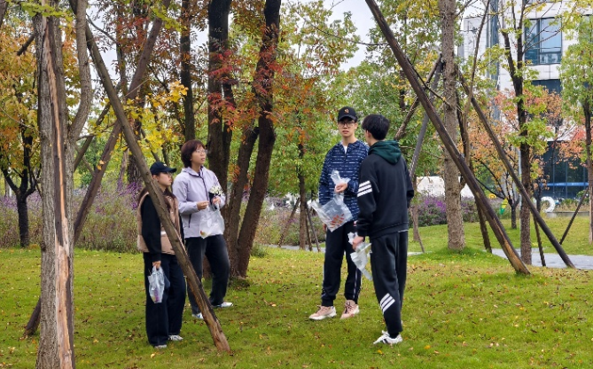 当日,清水河校区秋意正盛,金黄的银杏、火红的枫叶与粉紫色的黛子草交织成一幅流动的秋景。细雨如丝,微风拂面,为活动增添了几分灵动与诗意。活动伊始,同学们在教室中集合分组,讨论组名与口号,并设计了富有趣味的造型展示。“让我们把秋天带回家!”、“早知道要上台就不来了”等创意口号引得阵阵笑声,现场气氛热烈融洽。