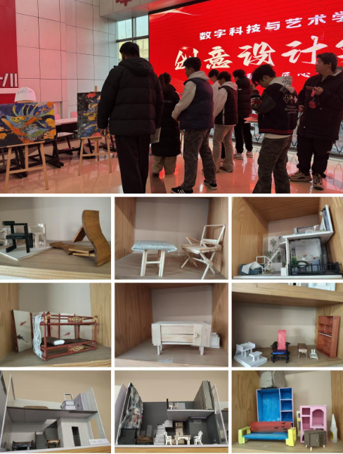 观展区域内展示了环艺和视传专业学生设计制作的掐丝珐琅作品与室内设计模型,集中呈现了学院学子的专业成果,精美的珐琅纹样、精巧的模型结构,彰显了精益求精的工匠精神与艺术创意设计结合的独特魅力。