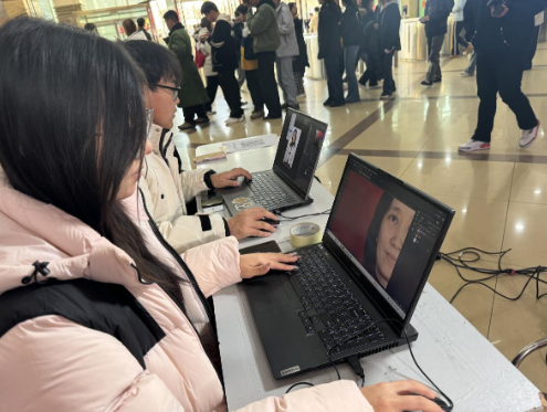 学院将专业技能与趣味互动深度融合,在集市上分设了多个特色体验项目和观展区域。拍摄体验区配备高清相机、专业打光设备及移动修图工作站,由影视和数媒专业的学生进行摄影与后期处理,并现场成片。