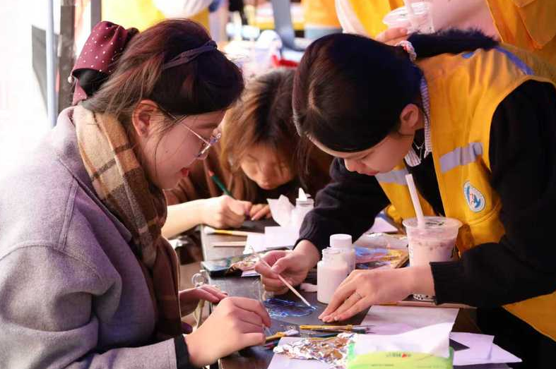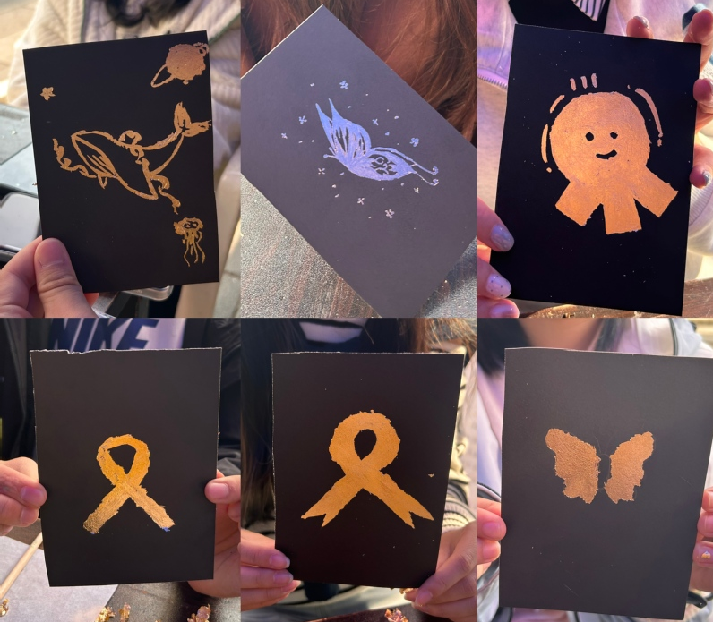 参与者们以胶为笔,在墨色卡纸间细细勾勒红丝带的轮廓。随后将细碎烧箔轻覆其上,让胶质静静吸附光泽。待胶汁微干,轻拂浮箔,璀璨的图案跃然纸上,恰是“生命因爱与关怀而闪耀”的最美注脚。