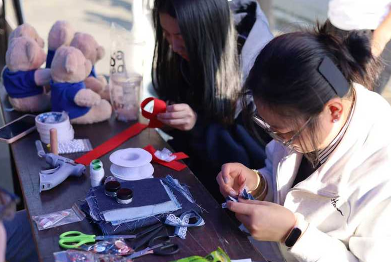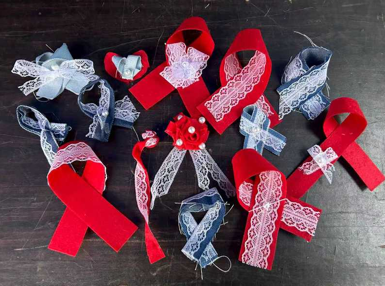 参与者们充分发挥想象力,选取牛仔布、不织布等基础材料,通过手工缝制或热熔胶枪粘贴珍珠、亮片、蕾丝等辅料,制作出独一无二的防艾主题胸针。每一枚亲手制作的胸针,不仅是时尚的装饰,更成为流动在校园里的关爱符号。