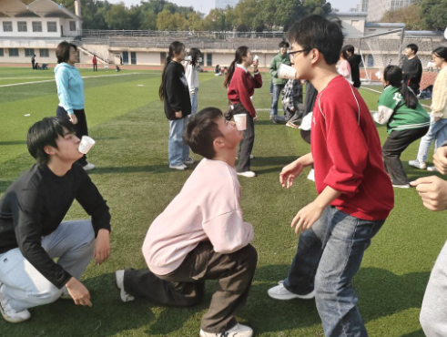 活动共设置纸杯传球、背夹气球、三人四足三个趣味运动。纸杯传球考验队员间的默契配合,背夹气球比拼速度与协作,三人四足则挑战团队的步调一致。各小组你追我赶,欢呼声、加油声此起彼伏。同学们在轻松体验中拉近距离、愉悦身心。