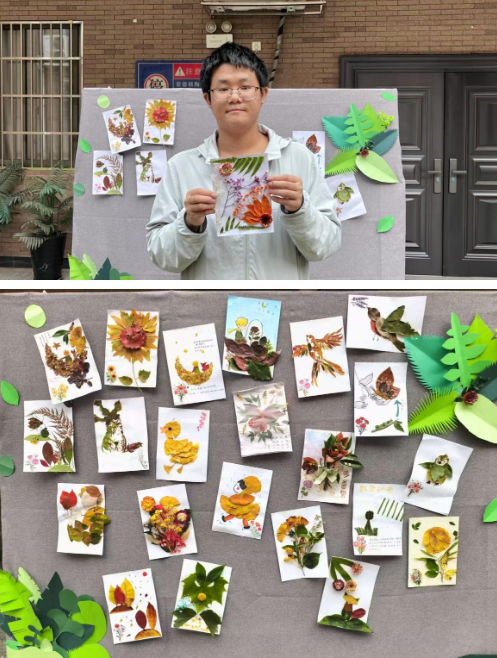 同学们围坐一堂,全身心投入创作。大家仔细甄选叶片,依据其独特形状、色彩与纹路构思主题,随后通过裁剪、蘸胶、调整角度、按压固定等操作,将平凡落叶转化为精美的拼贴作品。创作现场秩序井然,氛围热烈,不少同学还在作品旁附上真挚祝福,让每一件作品既饱含自然意趣,又彰显创意巧思。