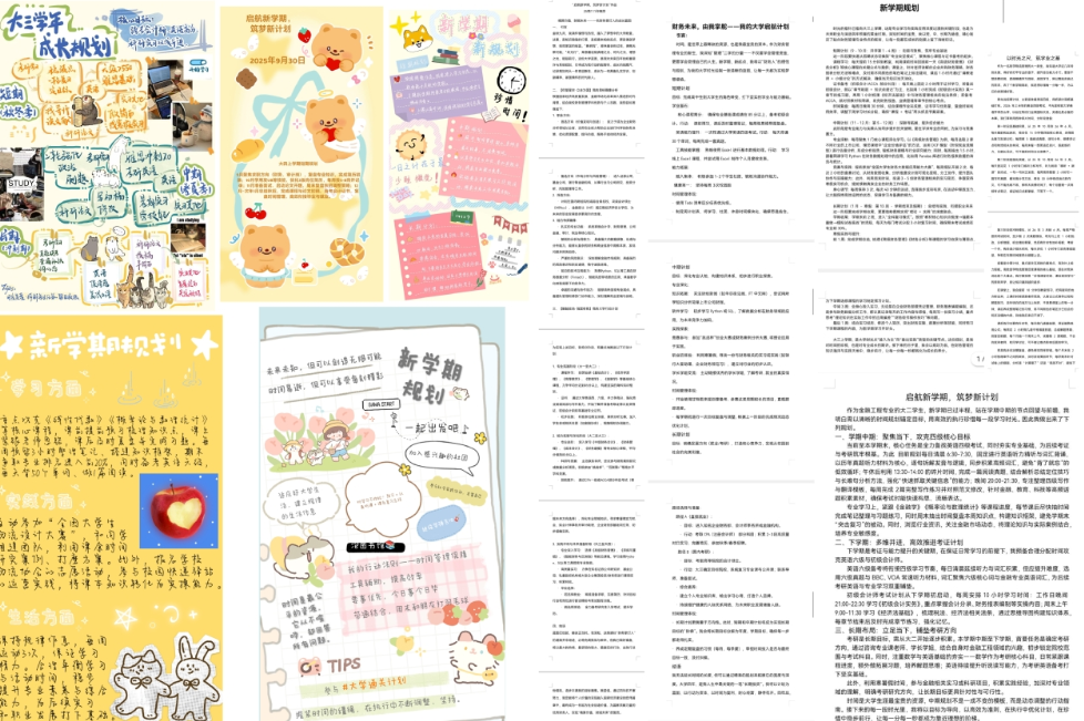 本次活动聚焦“目标规划”与“方案落地”两大核心:一方面引导同学们明确新学期长期与短期目标,清晰未来方向;另一方面鼓励大家撰写具体规划内容,制定实际可行的推进方案。活动中,多位同学凭借特色鲜明的规划作品脱颖而出,部分作品以理性视角构建成长路径,部分通过手绘插图生动呈现成长思路,还有新生以细腻笔触勾勒大学四年规划,传递出“在学习与休息间找平衡,在努力与松弛间寻自在”的积极态度,与活动初衷高度契合。